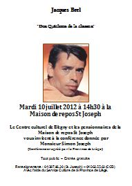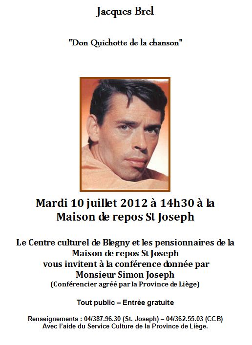 Comme son héros Don Quichotte, Jacques Brel rêvait d'impossible aventure, d'inaccessible étoile et d'éphémère dulcinée. Cette conférence vous permettra de pénétrer plus profondément dans l'univers particulier de cet homme exceptionnel et combien merveilleux.